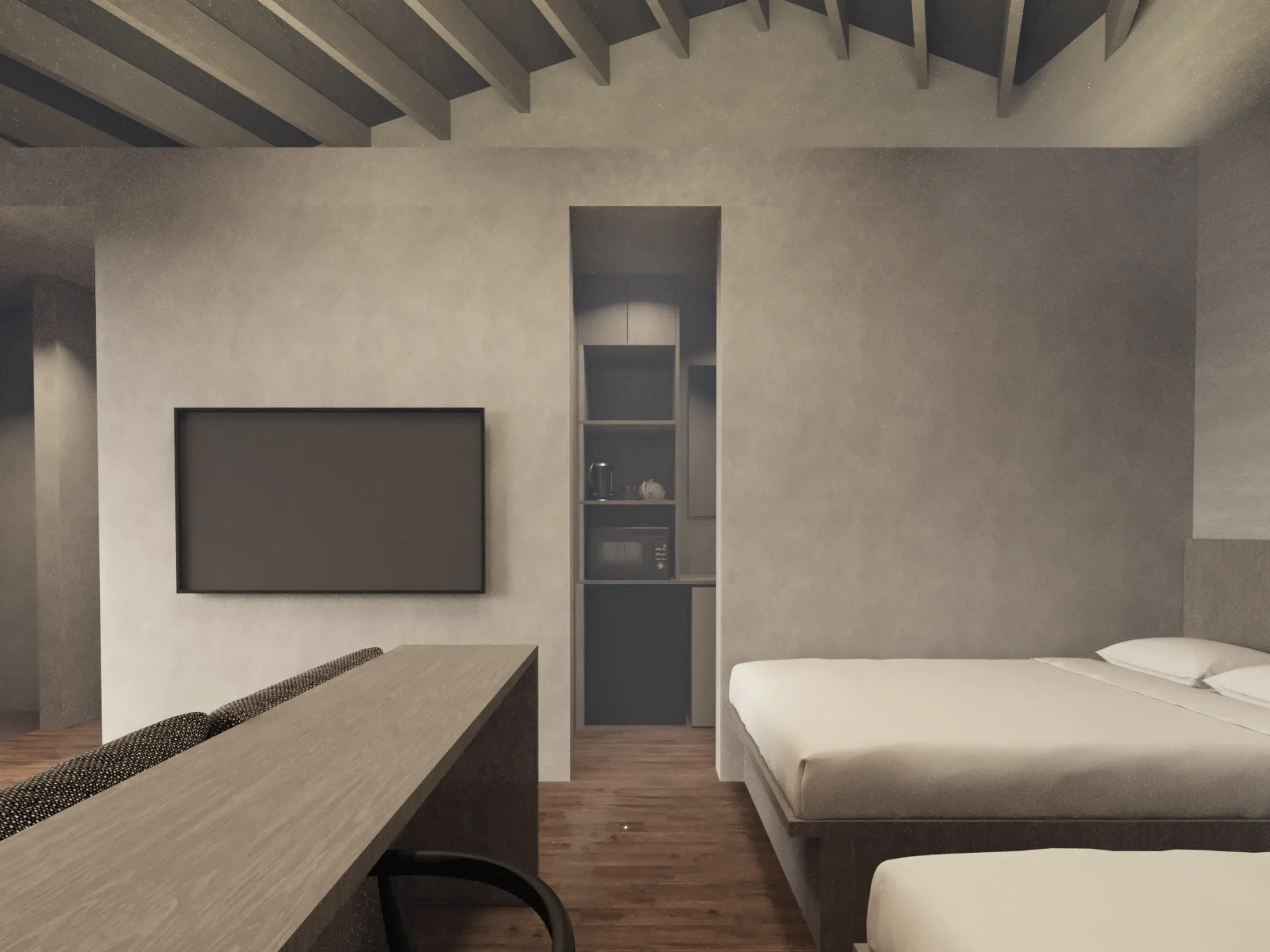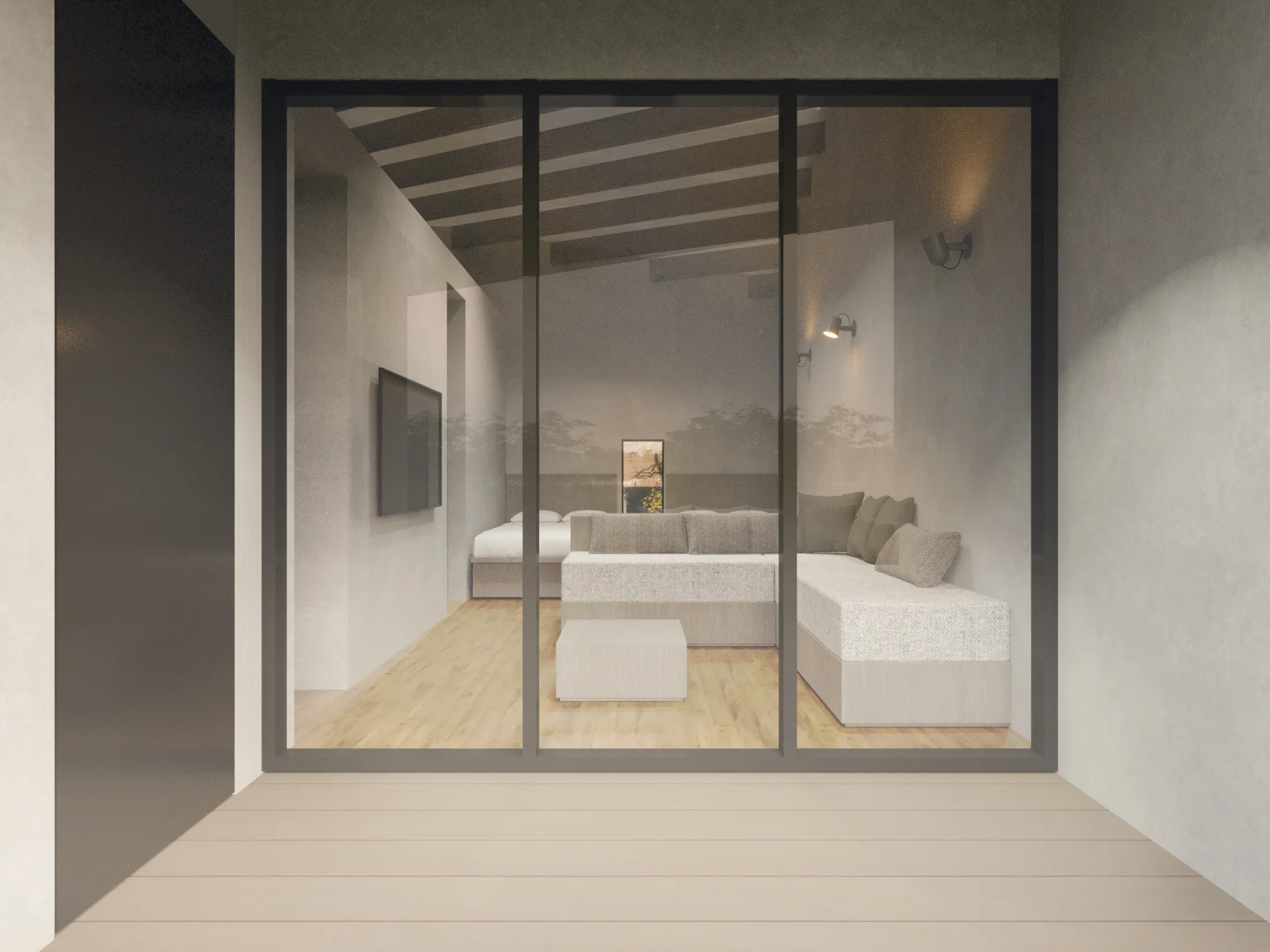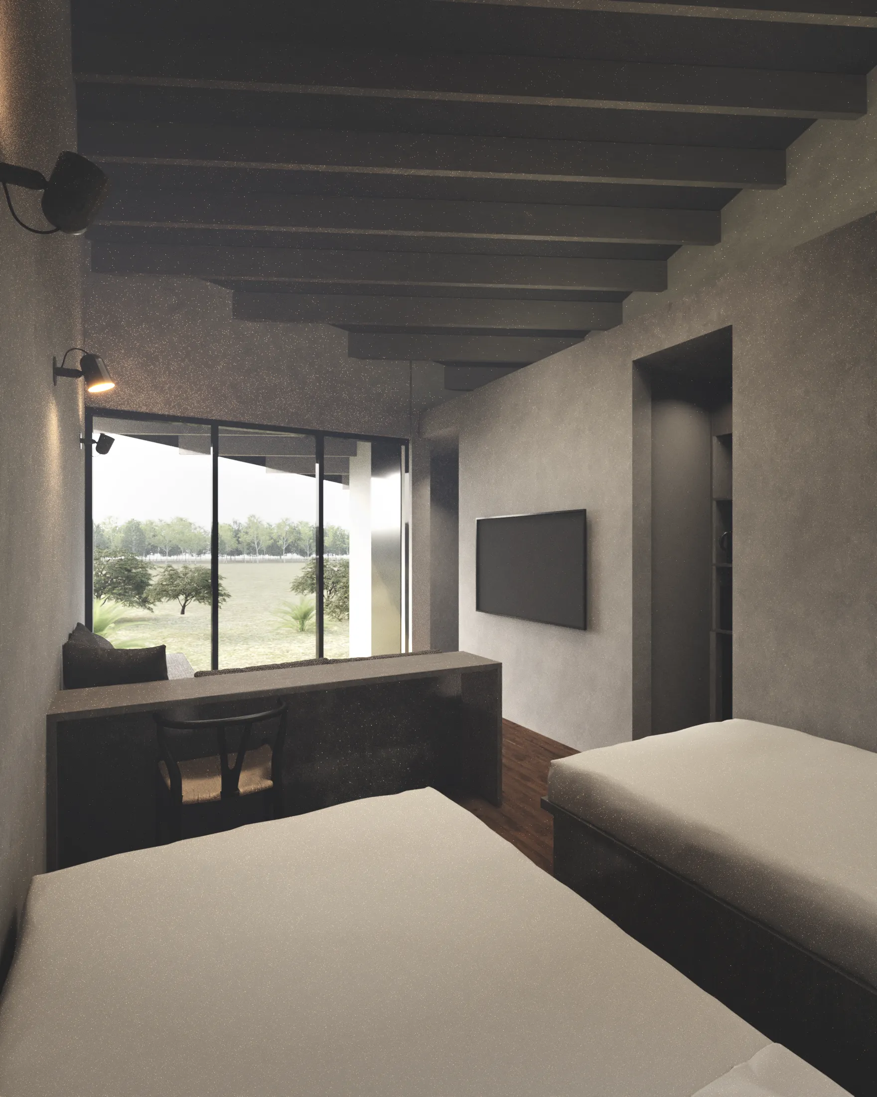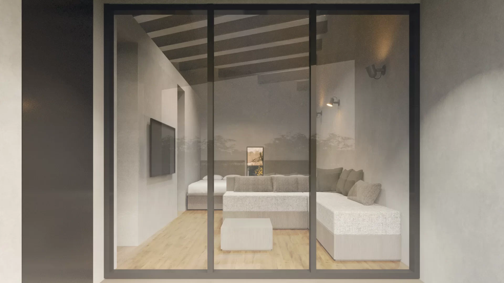 True to its name, “Syncline,” the variations in the cross-section—guided by the roof’s form—introduce an organic fluctuation to the space. Beneath a single roof, the atmosphere shifts: at times high and liberating, at others low and intimate. Through the momentary transitions of ceiling height, particles of light, and the space’s center of gravity, this compact architecture encompasses a diverse spatial experience with a depth reminiscent of geological strata.