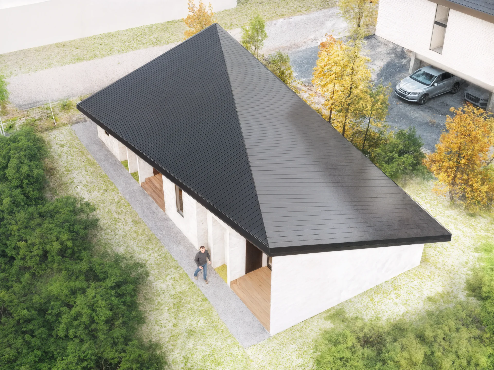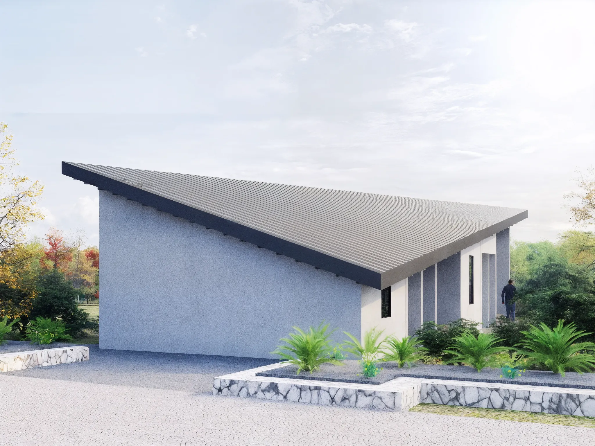 豊かな自然を湛える別荘地、その一角に佇むゲストハウスの計画である。 周囲の緑陰や視線の交錯を静かに受け止めるシンプルな躯体。そこに架かるのは、斜めに走る棟(むね)が幾何学的な稜線を描く、特徴的な屋根である。